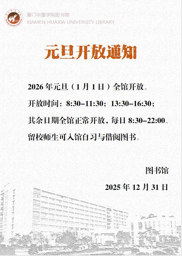 导航痕迹 厦门华厦学院图书馆 首页 通知公告 通知公告 元旦开放通知 2025年12月31日 14:50 点击: 下一条:深耕阅读文化品牌 构建书香华厦典范——厦门华厦学院以文化力量培育时代新人纪实 【关闭】